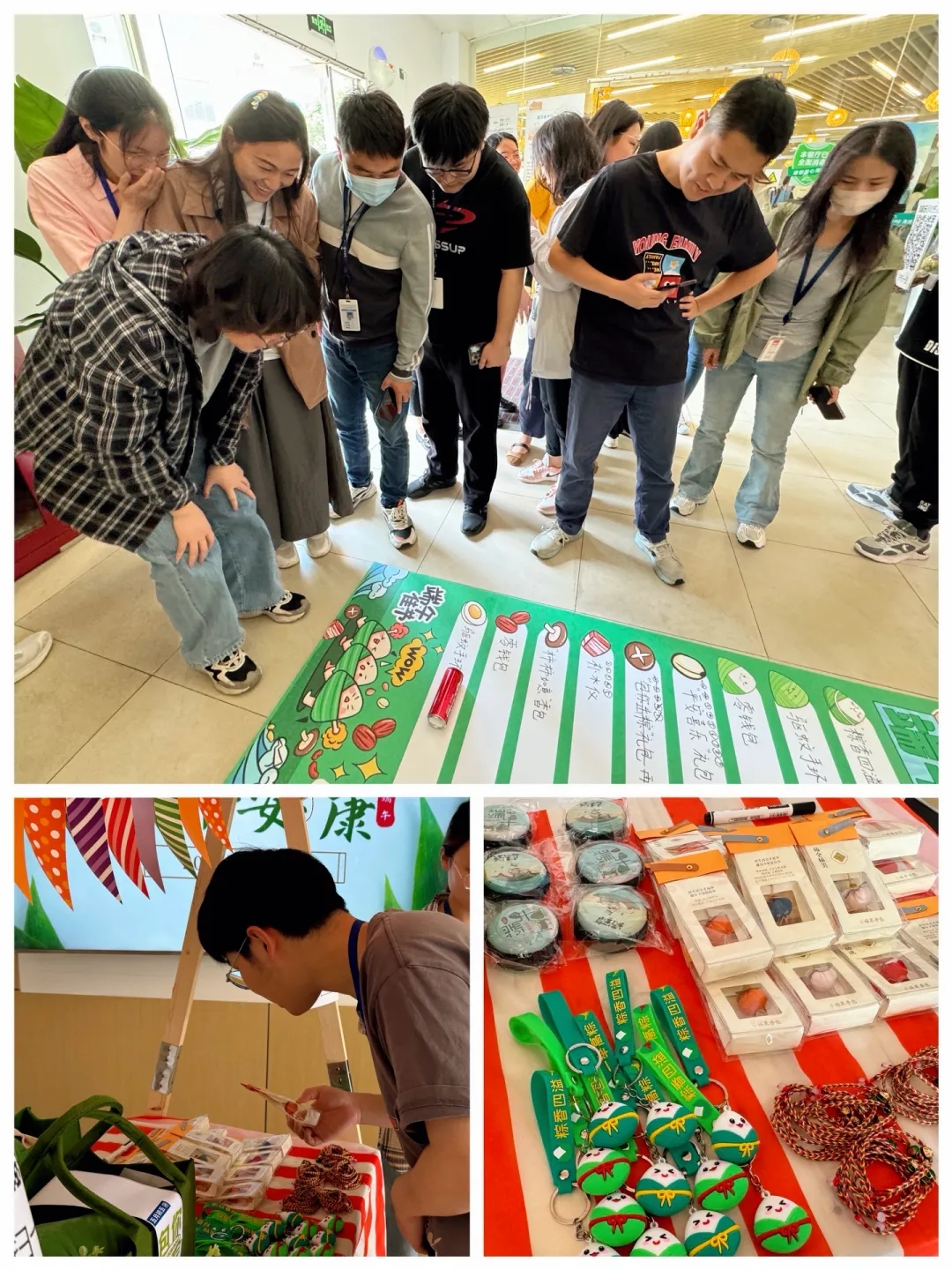“端午滾滾樂”:食堂入口處,鋪上了一塊兩米長的地毯,裝點(diǎn)著可愛的小粽子,大小相同的空白窗格像階梯一樣列隊(duì)在地毯中央。員工們紛紛加入游戲,站在指定位置,將飲料罐滾動至相應(yīng)窗格中,獲得驚喜獎品;未能獲獎的員工,也都領(lǐng)取到端午節(jié)五色繩。海陵工會為員工們準(zhǔn)備了端午大禮包、補(bǔ)水儀、端午掛飾、零錢包等眾多獎品,活動現(xiàn)場熱鬧非凡,員工們積極參與游戲,共祝端午安康。