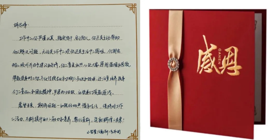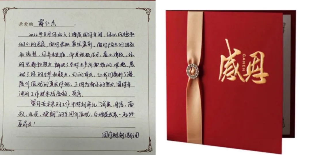 海陵衷心對他們的付出表示感謝,并為其準(zhǔn)備了感恩卡和禮物,直屬領(lǐng)導(dǎo)“驚喜出現(xiàn)”,將手寫感謝卡和禮物交給他們!