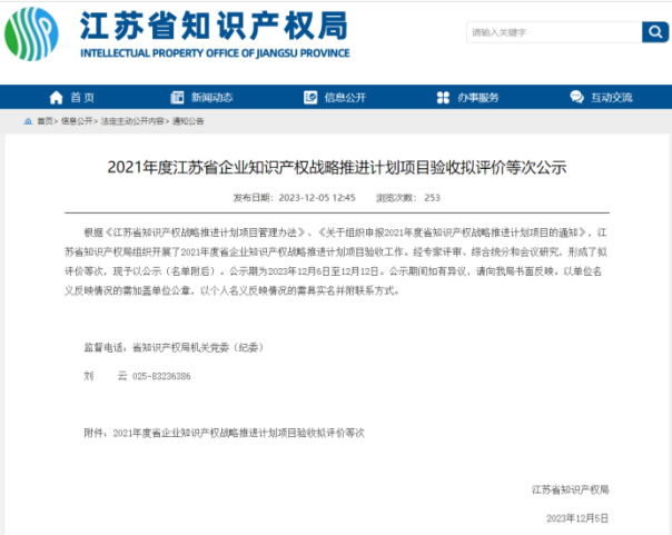 近日,江蘇省知識產權局公示了江蘇省企業(yè)知識產權戰(zhàn)略推進計劃項目驗收擬評價等次名單,南京海陵成功通過項目驗收,為企業(yè)高質量發(fā)展奠定基礎。