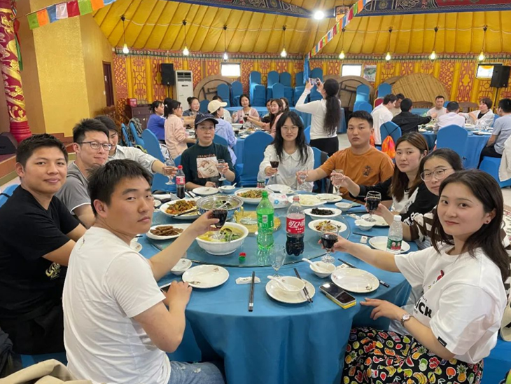 結(jié)束頒獎(jiǎng)后,一行人談笑風(fēng)生地步行前往“蒙古大營(yíng)”,走進(jìn)用餐區(qū),一個(gè)個(gè)或大或小的蒙古包映入眼簾,落日余暉下的風(fēng)景讓人深感民族特色。大家圍坐在桌旁,享用美味晚餐,幸運(yùn)的我們還觀賞到蒙古族歌曲、舞蹈、和馬頭琴的驚喜表演。